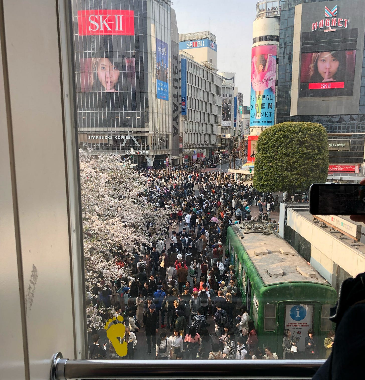 We watched from above to get a sense of the crowd before braving it ourselves. There was a little debate about whether seeing it was “good enough.” The intersection lights manage the flow of cars, and every two minutes, all cars are stopped. Pedestrians from every direction cross at the same time.
