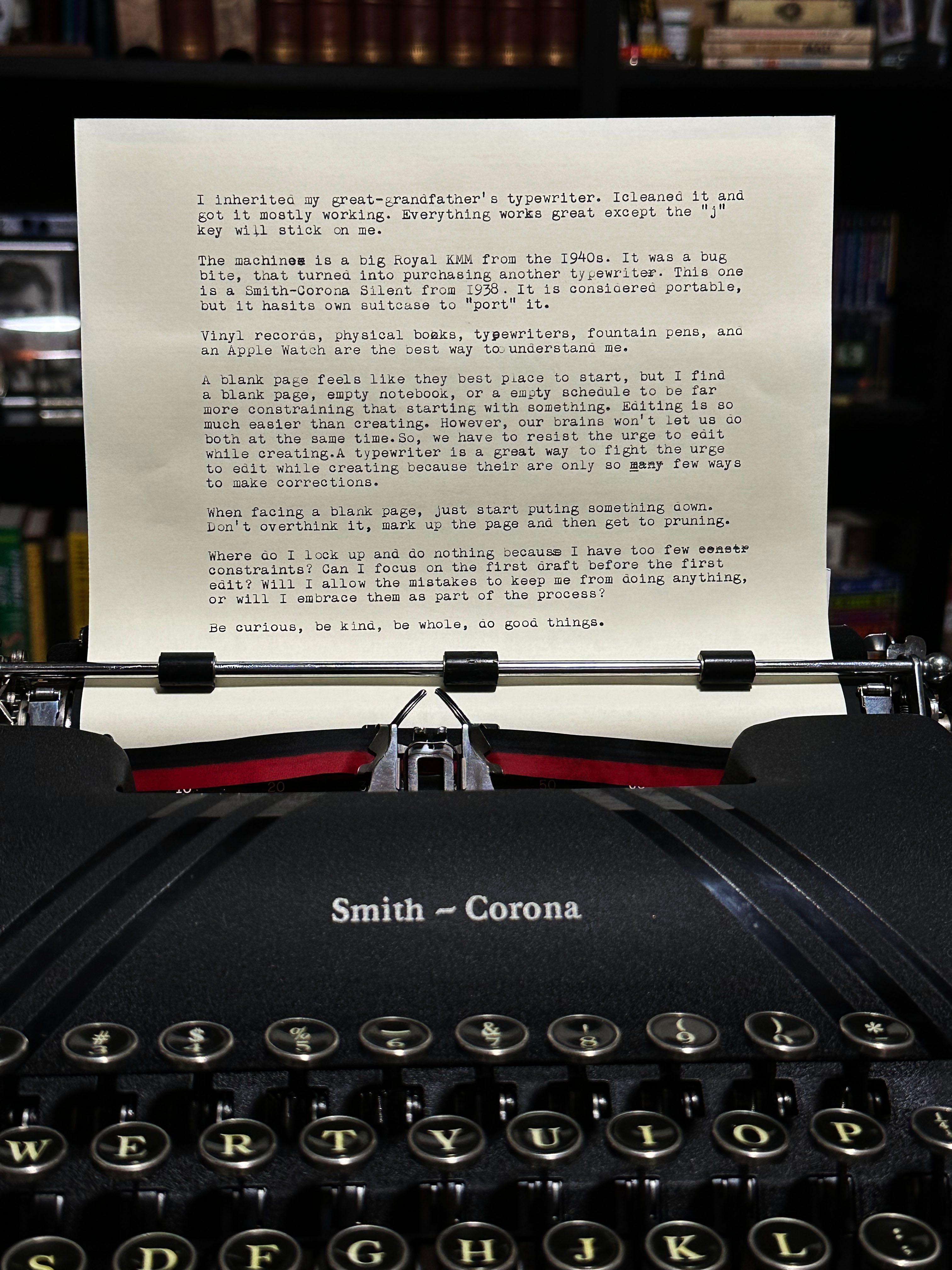 A blank page feels like they best place to start, but I find a blank page, empty notebook, or a empty schedule to be far more constraining that starting with something. Editing is so much easier than creating. However, our brains won’t let us do both at the same time.So, we have to resist the urge to edit while creating.A typewriter is a great way to fight the urge to edit while creating because their are only so many few ways to make corrections.